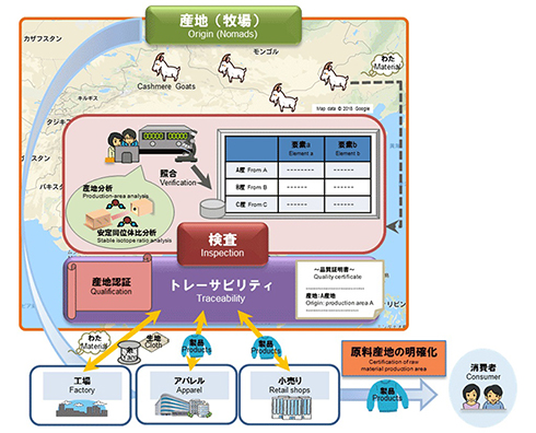 ケケン試験認証センターとNTTは、高性能半導体レーザーを用いてカシミヤ毛に含まれる元素の安定同位体比を分析し、産地を割り出す技術を開発。同技術で、市場に流通するカシミヤ製品の産地を推定する「カシミヤ品質検査システム」の共同実証を始める。2019年夏以降のサービス化を目指す。