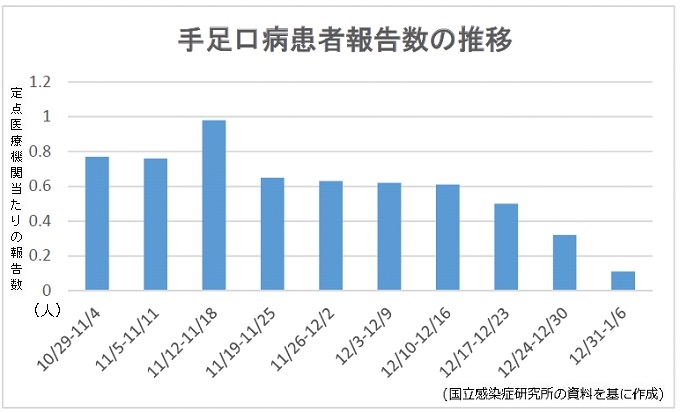 国立感染症研究所がまとめた12月31日から1月6日までの週の5類感染症の患者報告(小児科定点医療機関約3000カ所、速報値)によると、手足口病の定点医療機関当たりの患者報告数が7週連続で減少した。伝染性...