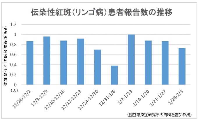 国立感染症研究所がまとめた1月28日から2月3日までの週の5類感染症の患者報告(小児科定点医療機関約3000カ所、速報値)によると、伝染性紅斑(リンゴ病)の定点医療機関当たりの患者報告数が3週連続で減少...